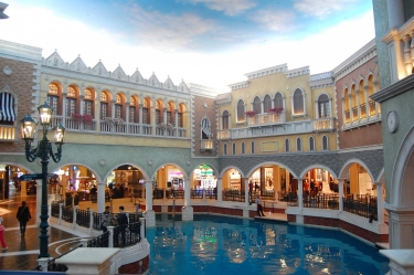 7.【澳门威尼斯人度假区】,以美国拉斯维加斯威尼斯创意为主体的威尼斯人度假城以威尼斯水乡为主题,酒店周围内充满威尼斯特色拱桥、运河及石板路,这里有着世 界最壮观的室内蓝天白云,夜间繁星密布,感受威尼斯人浪漫狂放的异国风情。大运河的两岸云集了几百家大牌购物商铺,数十家的餐饮店,环境典雅瑰丽,人游到此仿如置身昔日威尼斯的街道。