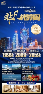 车游【港珠澳大桥】(车程约 45 分钟) 港珠澳大桥东起香港国际机场附近的香港口岸人工岛,向西横跨南海伶仃洋水域连接珠海和澳门人工岛,止于珠海洪湾立交。桥隧全长 55 千米,其中主桥 29.6 千米,香港口岸至珠澳口岸 41.6 千米,桥面为双向六车道高速公路,设计速度 100 千米/小时。先后途经东西人工岛、海底隧道、风帆塔、中国结塔、海豚塔等标志地点,一路见证天堑变通途的世界奇迹,前往素有“东方蒙地卡罗 ”的澳门 ,抵达后,前往澳门挤酒店入住。