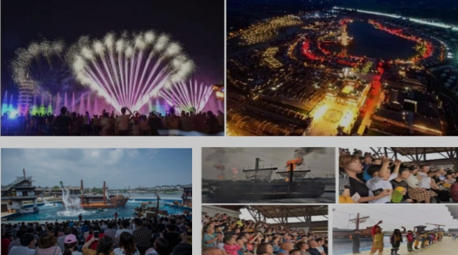 到达景区后,导游购票办理进园,后参观体验游览,观看《黑石号特技秀》“黑石号”特技秀场演出荷载 1500 座,演出时间约 30 分钟,特技秀表演以“黑石号”沉船为背景,由创作长隆欢乐世界“惊爆危机岛”的美国幻景娱乐公司指导,将再现当年“黑石号”商船扬帆出航,船长与海盗在风浪搏斗中沉没,并由海神托起再生的故事。该“秀”将综合运用火焰、造浪、爆破、沉降等 100 余项特技,并有 20 余名中外特技演员在水中表演。